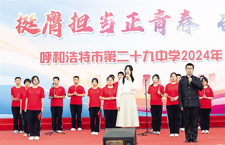 9月30日,学生诵读《请党放心强国有我》。为庆祝中华人民共和国成立75周年,展现当代中学生的精神风貌,当日,呼和浩特市第二十九中学2024年(第十一届)校园文化艺术节启幕,艺术节以“挺膺担当正青春、奋楫扬帆向未来”为主题,通过丰富多彩的艺术活动,培养学生的创新精神和社会责任感,厚植爱国情怀。