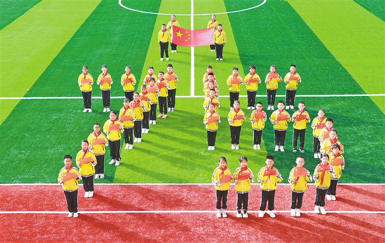 在锡林郭勒盟,多伦县第二小学组织开展“我与国旗合个影”活动,庆祝中华人民共和国成立75周年,少先队员们纷纷与国旗合影,表达对祖国的热爱和祝福。