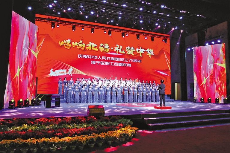 “五星红旗迎风飘扬,胜利歌声多么响亮,歌唱我们亲爱的祖国,从今走向繁荣富强……”在庆祝中华人民共和国成立75周年·集宁区职工合唱比赛上,来自乌兰察布市集宁区的19支合唱队的1300余名职工,用嘹亮的歌声表达对祖国的无限热爱和最真挚的祝福。