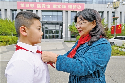 为少先队员佩戴红领巾。