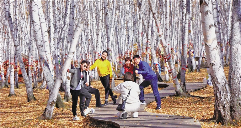 10月2日,游客打卡呼伦贝尔白桦林。秋天,是呼伦贝尔最绚丽的季节,河流湖泊和兴安林海五彩缤纷、动静相宜,斑斓画卷令人陶醉。本报记者 李新军 摄