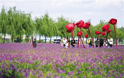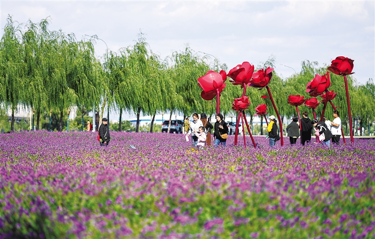 10月2日,人们在呼和浩特市赛罕区郊野公园游玩。国庆假期,呼和浩特市赛罕区大黑河沿岸马鞭草、格桑花等多种花卉竞相开放,花海游人如织。 本报记者 孟和朝鲁 摄