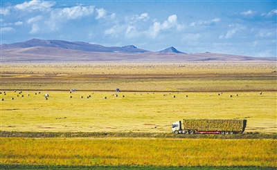 金秋时节,通辽霍林郭勒市草原军马场4.3万亩苜蓿开镰收割。趁天气晴好,牧民们抓紧打草,割草机、搂草机、捆草机轮番作业,为牲畜越冬备足“口粮”。本报记者 李佳雨 摄