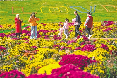 10月7日,游客徜徉在呼和浩特市回民区宇生乐谷丰现代农业产业园色彩斑斓的花海中,乐享假日时光。产业园规划占地2000亩,不仅有菊海,还有梦幻婚礼草坪、共享农田、星空帐篷营地等场地,初步形成了“农业+文化+旅游”的产业布局。