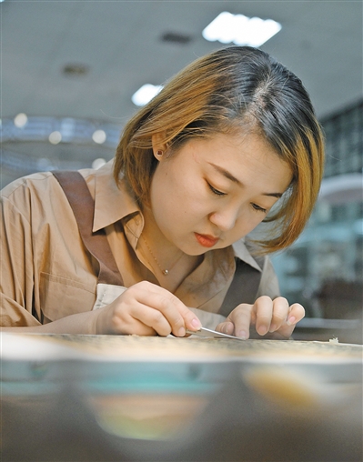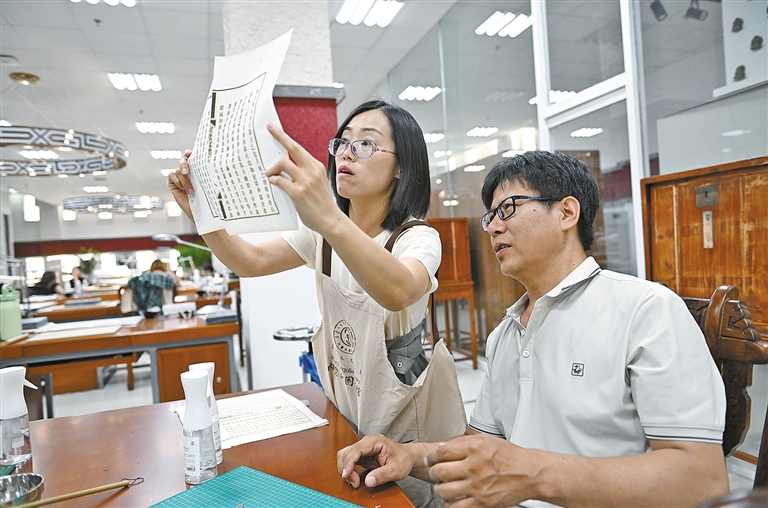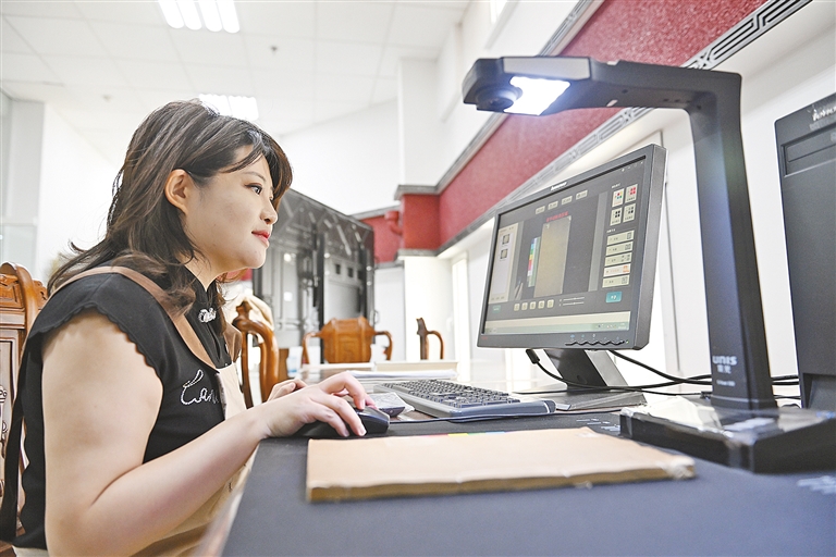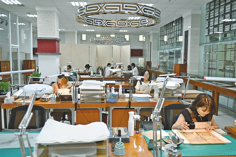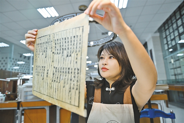 凝神,一贴一补,轻轻压平。在内蒙古自治区图书馆古籍修复室,古籍修复师胡雅婧正将一沓泛黄的书页小心翼翼地铺展在工作台上。“这是我最近在修复的明刻本《南史》,残损不算严重,但脆化比较严重。”胡雅婧拿起毛笔,蘸上糨糊,将补纸粘贴到缺损处,再用镊子把多余的补纸剔掉……一旁的压书板下,已经修复好的书叶平整舒展,古籍悄然“新生”。