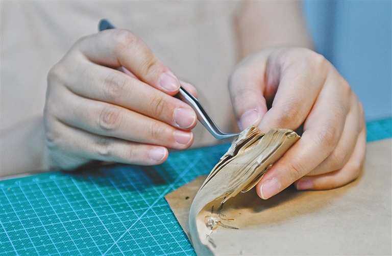 胡雅婧介绍,古籍经过了漫长岁月的侵蚀后,大多存在霉变、虫蛀、酸化、脆化等一身疾病,古籍修复工作就是为这些古籍“治病”,赋予这些残损破旧的古籍新的生命力。修复古籍的工作看似简单,却异常繁琐,通常需要拆线、编号、去污、配纸等20多道工序,每一道流程都很重要,每一个步骤都马虎不得。