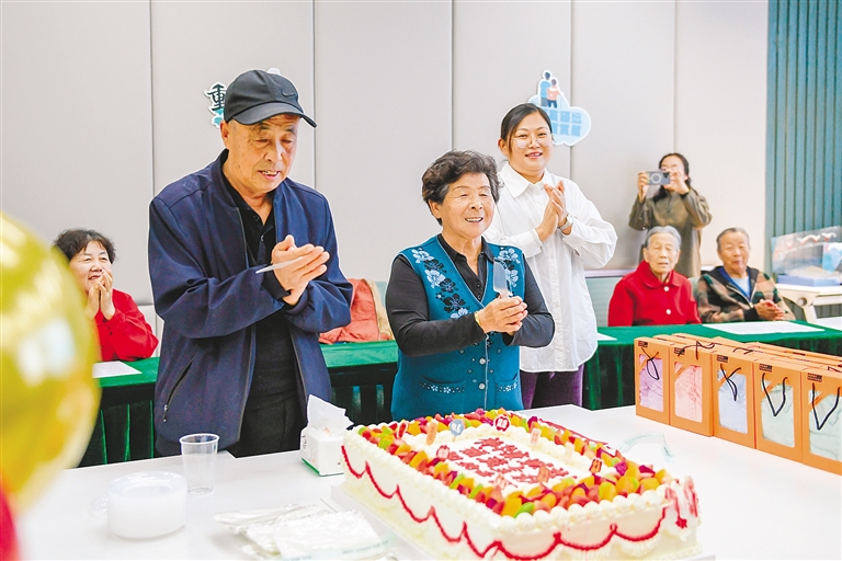 10月10日,鄂尔多斯市康巴什区青春山街道神华康城社区举行“我们的节日·福满金秋 相约重阳节”活动。该社区的工作人员和老人们欢聚一堂,为过生日的老人举行“长者生日宴”,大家围坐在一起品尝蛋糕,其乐融融。本报记者 王晓博 摄
