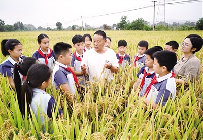 10月16日,浙江省武义县三角店小学学生在壶山街道三角店村稻田里听农民讲水稻种植过程。当日是世界粮食日,各地开展主题教育活动,增强孩子们爱惜粮食、节约粮食的意识。 新华社发