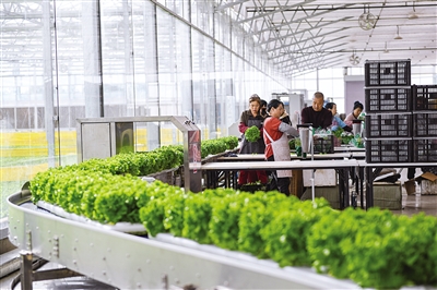 10月18日,在鄂尔多斯市达拉特旗广汇·绿沃川现代数字农业科技产业园,村民在智能蔬菜工厂自动化生产线上包装新鲜蔬菜。产业园通过“土地流转、二次分红”的方式与村集体、村民进行合作,优先聘用区域农牧民、困难群体入园就业,带动农牧民持续增收致富。目前,项目预计年均销售收入约4500万元,带动就业500余人。