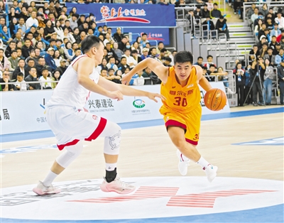 10月26日,鄂尔多斯队队员(橙)在运球突破。当日,由内蒙古自治区体育局主办、内蒙古篮球协会承办的2024年内蒙古自治区男子篮球联赛(蒙BA)季后赛总决赛收官。经过激烈角逐,鄂尔多斯队101:82战胜呼和浩特队,以总比分2:0夺得总冠军,呼和浩特队获得亚军。本报记者 孟和朝鲁 摄