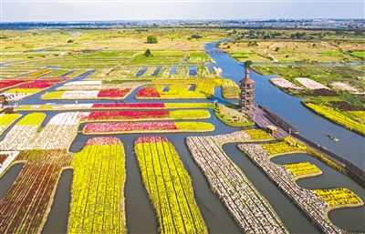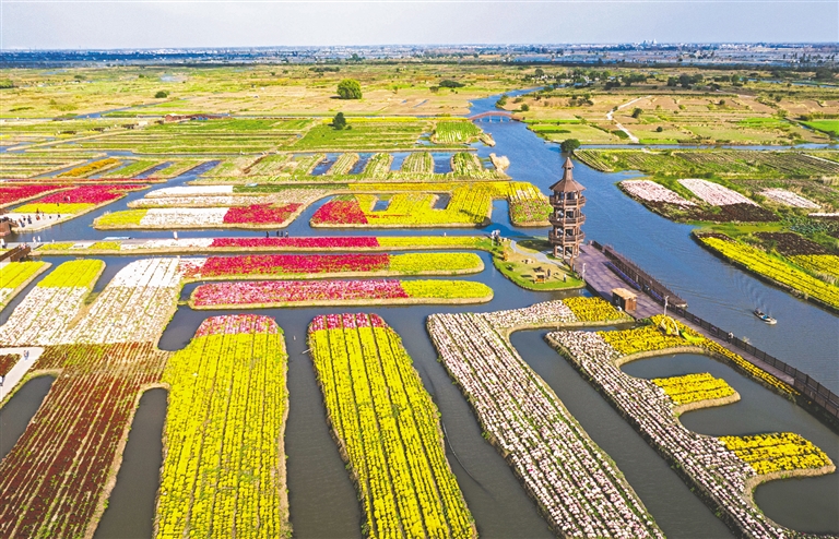 10月25日,游客在江苏省兴化市千垛景区赏菊游玩(无人机照片)。金秋时节,华夏大地层林尽染,诗意斑斓。 新华社发