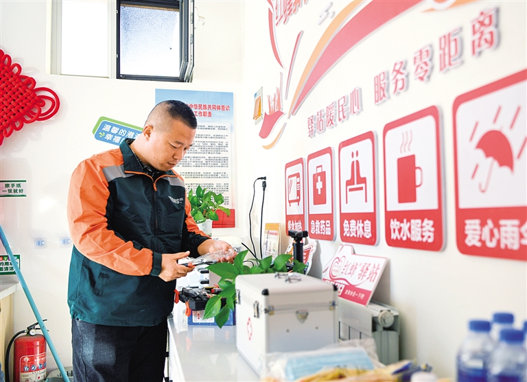 10月29日,呼和浩特市新城区东风路街道丽苑社区红蜂驿站启动。该驿站为快递员、外卖骑手、环卫工人等群体提供全方位服务。近年来,呼和浩特市各旗县区以社区、商圈等快递物流从业人员密集场所为重点,整合街道、社区场地和资源建设红蜂驿站,为各类人群提供便民服务。本报记者 孟和朝鲁 摄