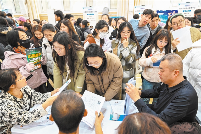 11月9日,求职学生在招聘会上寻找就业机会。当日,“千企万岗进校园·勠力同心促就业”自治区教育行业专场招聘会在内蒙古师范大学赛罕校区举行。来自区内外167家企事业单位参会,提供就业岗位4567个,吸引区内外近8000名毕业生参会。本报记者 王磊 摄
