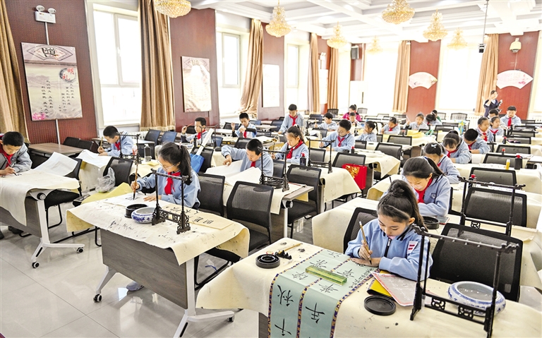 11月11日,小学生在书写毛笔字。当日,呼和浩特市赛罕区大学路小学以“笔墨凝书香,书写展风采”为主题开展师生书写素养展示活动。据了解,为鼓励学生规范书写汉字,该校不定期开展少儿书写比赛、诗词大会、经典诵读等活动。