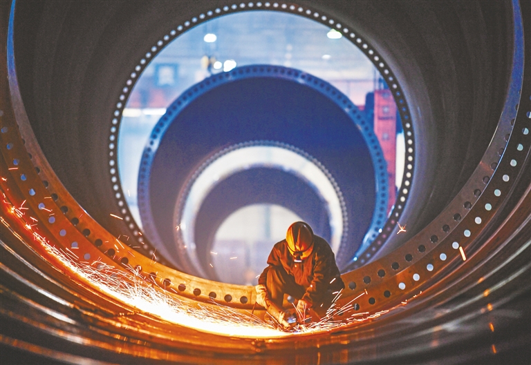 11月22日,包头市中国二冶集团钢结构工程技术分公司新能源塔筒制作基地内,工作人员正在紧锣密鼓制作风力发电机塔筒。据了解,该分公司共承制包钢(集团)白云鄂博矿区绿电直供等多个新能源项目的风力发电机塔筒150余套。本报记者 孟和朝鲁 摄
