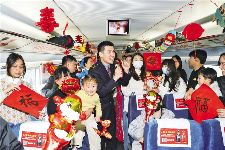 1月13日,在C3685次列车上,旅客与乘务人员互动。春运前夕,中国铁路上海局集团有限公司合肥客运段组织由铁路职工组成的非遗表演小分队登上C3685次旅客列车,为车厢内的旅客带来“庐州蛋雕”和黄梅戏表演等,并为旅客送上祝福。 新华社记者 杜宇 摄