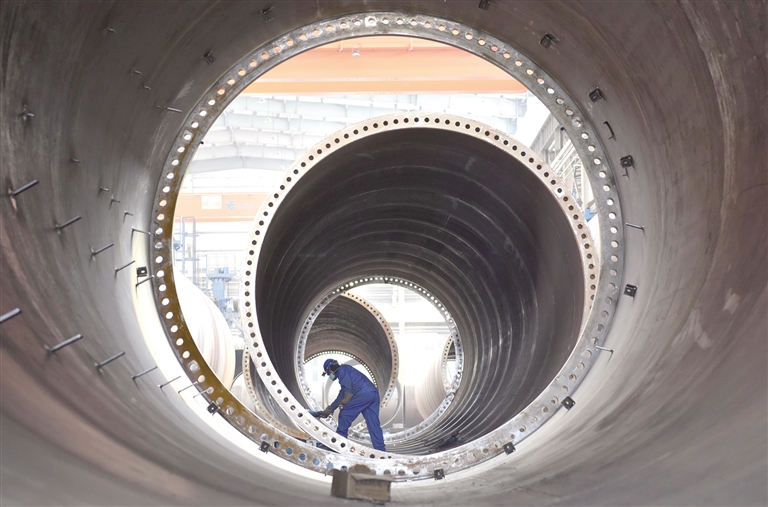 在促进新能源开发利用的同时,乌兰察布市坚持全产业链思维,协同推进新能源装备制造产业发展,引入了运达风电等主机装配企业,天顺、三兴、天能、银河新能源等塔筒制造企业以及远景、天顺叶片等叶片制造企业,扩大主机、叶片、塔筒等制造规模,引进培育电机、齿轮箱、电芯等核心产业,着力推动绿色能源绿色制造融合发展。目前,风电装备制造产业已初步形成以察哈尔高新区和商都县为主的两个产业集群,形成产能包括:整机1500台、风机叶片1200套、塔筒2050套44万吨,已具备10兆瓦及以上大型风机配套生产能力。