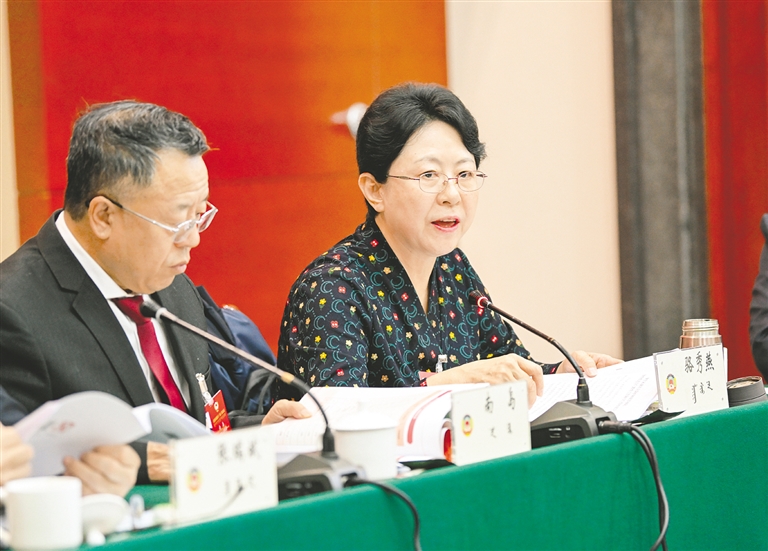 | 1月16日,在讨论两院工作报告时,自治区政协委员骆秀燕(右)建议,切实提升审判工作质效,下大力量解决“执行难”问题,加大对虚假诉讼的惩治力度,为高质量发展提供坚实的司法保障。本报记者 孟和朝鲁 摄 |