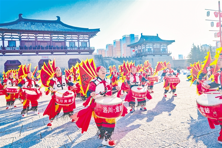 1月28日,在河南洛阳隋唐洛阳城天街,鼓手们进行洛川蹩鼓表演。新春将至,神州大地处处洋溢着喜庆的节日氛围。 新华社发