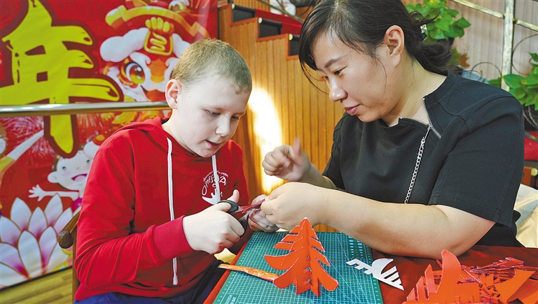 活动现场欢声笑语、热闹非凡,两国青少年一起学剪纸、制作中国特色手工串珠。他们认真学习每一个制作步骤,积极向中国老师请教,手中的剪刀、彩纸、珠子在巧手下变幻出各种精美的图案和造型。