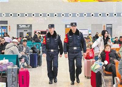 2月4日,呼和浩特铁路公安局包头公安处民警在巴彦淖尔站候车大厅里巡逻。当日是春节假期最后一天,迎来春节返程客流高峰,为确保旅客安全出行,呼和浩特铁路公安局包头公安处辖区各派出所加强站内巡逻检查,维护治安秩序,保障旅客平安返程。本报记者 孟和朝鲁 摄