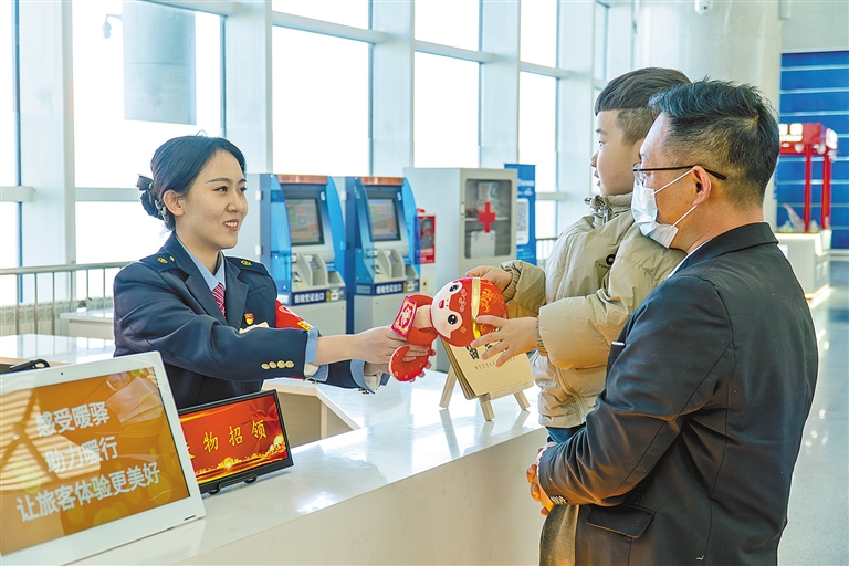 2月5日,记者来到鄂尔多斯火车站,熙熙攘攘的出行人群十分有序。为更好地服务出行旅客,鄂尔多斯车务段专门成立“暖行驿站”服务队,为旅客提供信息咨询引导、行李打包、遗失物品招领、重点旅客服务、“脱网”人群服务等一站式亲情服务。设置旅客满意度评价器和留言簿,广泛收集旅客意见,有针对性地加强改进客运服务工作。车站还全面升级改造了候车室取暖设施,通过更换双层保温玻璃、加装暖风机热风幕、补强门窗密封条等举措,确保候车室始终保持在18℃—20℃的舒适区间。同时,在候车室设立“暖行驿站”服务台,配备老花镜、充电线、轮椅、助听器等一系列便民设施,提升便民服务水平。