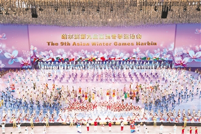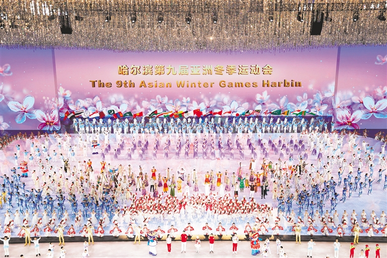 “雪花穹顶”映照下,正月初十的哈尔滨国际会展体育中心,格外璀璨。第九届亚洲冬季运动会开幕式正在这里举行。