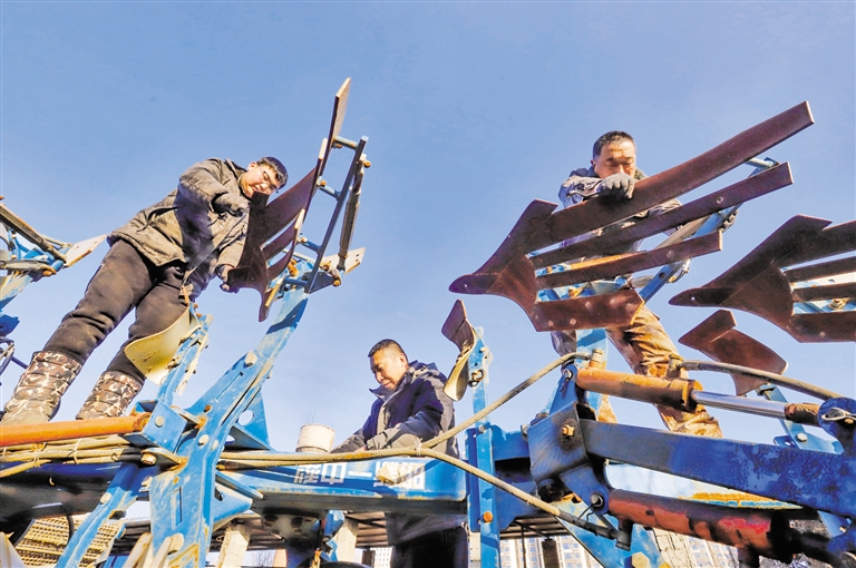 2月6日,河北省遵化市东新庄镇一家农机合作社的驾驶员在检修耕地设备。春耕生产在即,各地做好农机具检修、农用物资选购工作,为即将到来的春耕生产做足准备。 新华社发