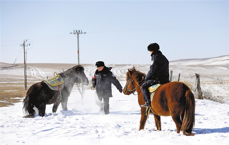交谈间,前方出现积雪严重路段,马蹄深陷。民警们纷纷下马,双手紧紧拉住缰绳,在一尺多厚的积雪中艰难跋涉。凛冽的寒风割得脸颊生疼,积雪很快浸湿了鞋袜,寒意从脚底直钻心底,可他们的步伐依旧坚定有力。