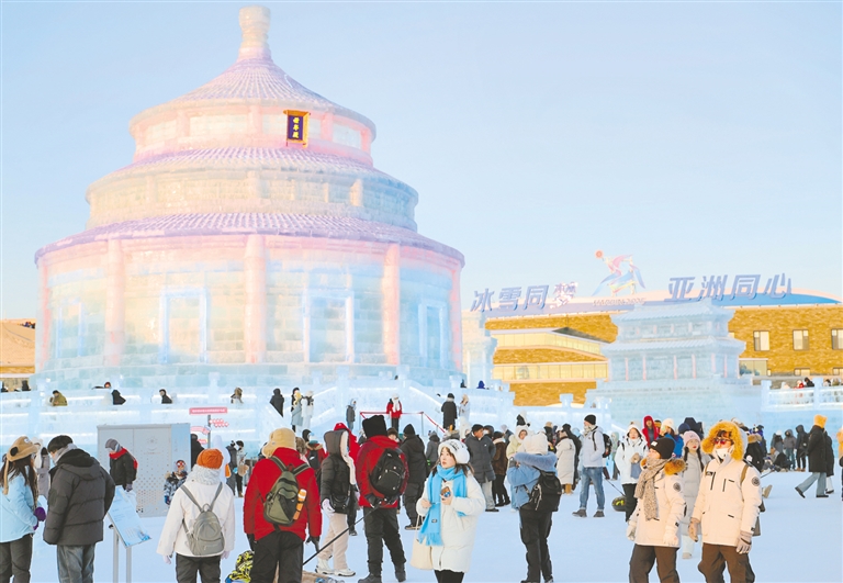 2月9日,游客在哈尔滨冰雪大世界游览。冰雪旅游热门目的地黑龙江哈尔滨在第九届亚冬会的带动效应下,吸引了众多国内外游客前来赏冰乐雪,感受冰雪之美。 新华社记者 侯俊 摄