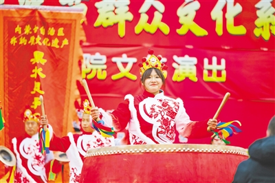 2月12日,新营子镇黑水泉村的非遗寿阳鼓正在表演。当日上午,呼和浩特市托克托县文化宫广场上人声鼎沸,随着一阵喜庆的锣鼓声响起,一年一度的元宵节群众文化系列活动正式拉开帷幕,舞龙、舞狮、秧歌、高跷等传统社火节目精彩纷呈。本报记者 郑学良 摄