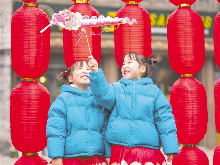 2月12日,一对姊妹花手持蛇灯在江苏省兴化市八字桥文旅休闲街区游玩。当日是元宵节,各地举办多彩活动,欢欢喜喜闹元宵。 新华社发