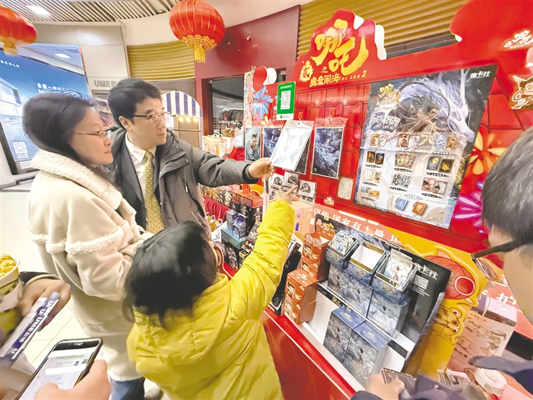 2月14日晚,在北京市海淀区的UME国际影城(华星店),家长带着孩子挑选电影纪念品。电影《哪吒2》自1月29日上映以来,深受观众喜爱。据网络平台数据统计,该电影票房总数已超一百亿元。电影的热映同时带动其衍生产品热销。 新华社记者 才扬 摄