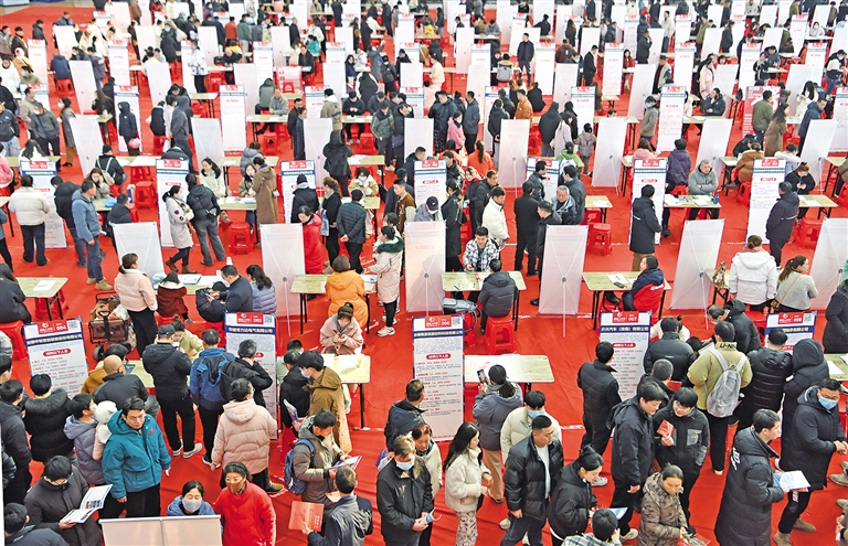2月17日,求职者在安徽省淮南市2025年“春风送暖”招聘会现场了解招聘信息。近日各地举行形式多样的求职招聘活动,为用人单位和求职者搭建沟通桥梁。