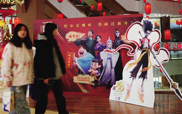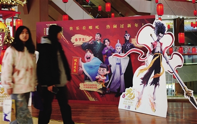 2月18日,在沈阳一家商场,顾客从电影《哪吒之魔童闹海》的宣传广告牌前经过。统计数据显示,截至18日,《哪吒之魔童闹海》累计票房(含预售)超123.19亿元,超过《头脑特工队2》的票房成绩,登顶全球动画电影票房榜。