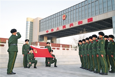 近日,武警内蒙古总队锡林郭勒支队某部组织开展了集体过“政治生日”活动,进一步强化官兵党员的身份意识、责任意识和担当意识,激发他们投身练兵备战的内在动力。图为党员官兵在国门前重温入党誓词。徐汪洋 摄