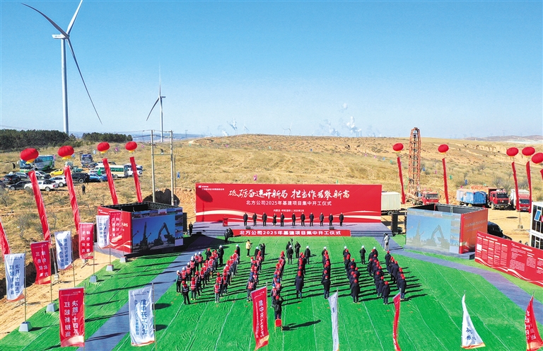 2月22日,在和林格尔县金桥和林火力发电灵活性改造配套消纳新能源48万千瓦风电项目现场,开工仪式正在进行。当日,华能北方公司10个新能源项目集中开复工,总规模720万千瓦,其中光伏450万千瓦,风电270万千瓦,预计全部投产后年发电量超过130亿千瓦时,每年可减少标煤400多万吨,减少二氧化碳排放1000多万吨。本报记者 怀特乌勒斯 摄