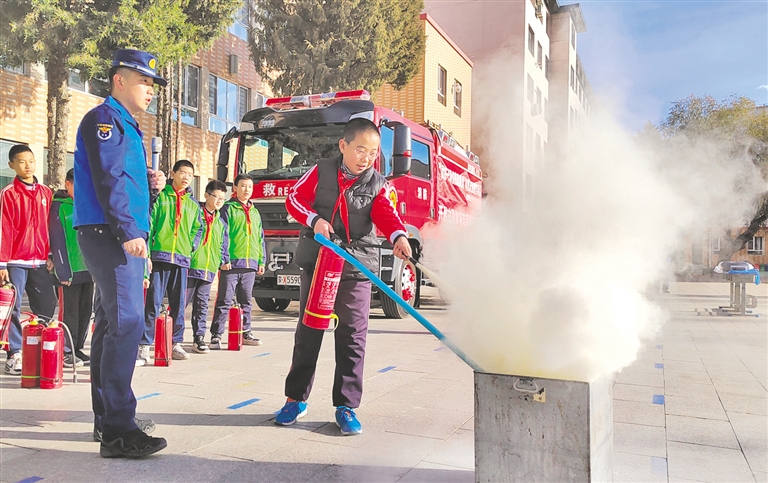 2月24日,在呼和浩特市赛罕区南门外小学,消防宣传员正在教学生使用消防设备。当日,呼和浩特市消防救援支队赛罕区大队走进辖区多所学校开展科普宣传活动。通过活动,让消防安全知识在广大师生心中扎根,实现“教育一个学生、带动一个家庭、影响整个社会”,营造全社会关注消防安全的良好氛围。