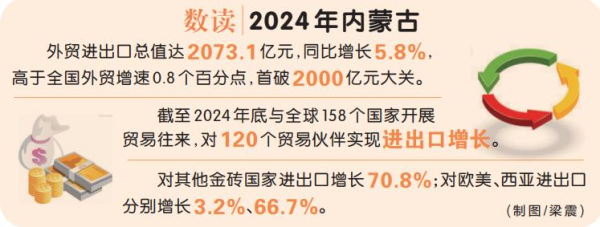 内蒙古外贸进出口总值2024年达2073.1亿元,同比增长5.8%,高于全国外贸增速0.8个百分点,首破2000亿元大关。在外贸整体实现稳中向好的过程中,内蒙古的贸易“朋友圈”也越来越大,截至2024年底,内蒙古与全球158个国家开展贸易往来,对120个贸易伙伴实现进出口增长。