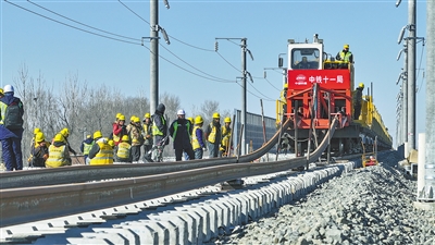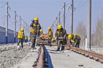 连日来,包银(包头至银川)高铁内蒙古段包头至临河间铺轨施工正在紧张进行。建设者们克服铺轨环境温度低、轨道精调技术要求高、工期紧迫等挑战,保证了铺轨施工顺利进行。