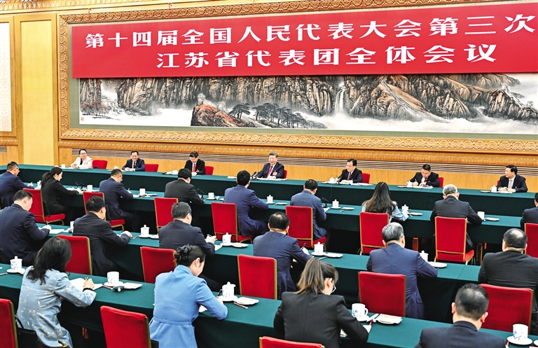 在听取大家发言后,习近平作了发言。他首先表示赞成政府工作报告,对江苏工作予以肯定,希望江苏落实好挑大梁的责任,努力取得新的更大成绩。
