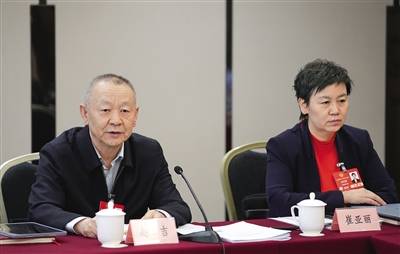 3月7日,住内蒙古全国政协委员赵吉(左)建议,企业协同进行订单式培养,合作共建共管“科技小院”“创新工厂”等产教融合研究生联合培养基地。 本报记者 王鹏 摄