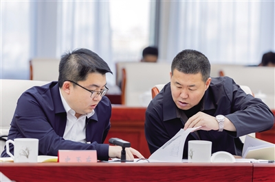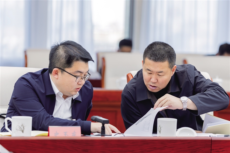 3月8日,在审议全国人大常委会工作报告时,史玉东代表(左)与薛志龙代表深入交流。 本报记者 于涛 摄