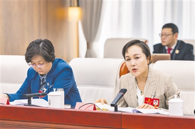 3月9日,全国人大代表奇飞云(右)在审议“两高”工作报告时建议,加大对环境资源专业审判人才的培养力度。 本报记者 于涛 摄