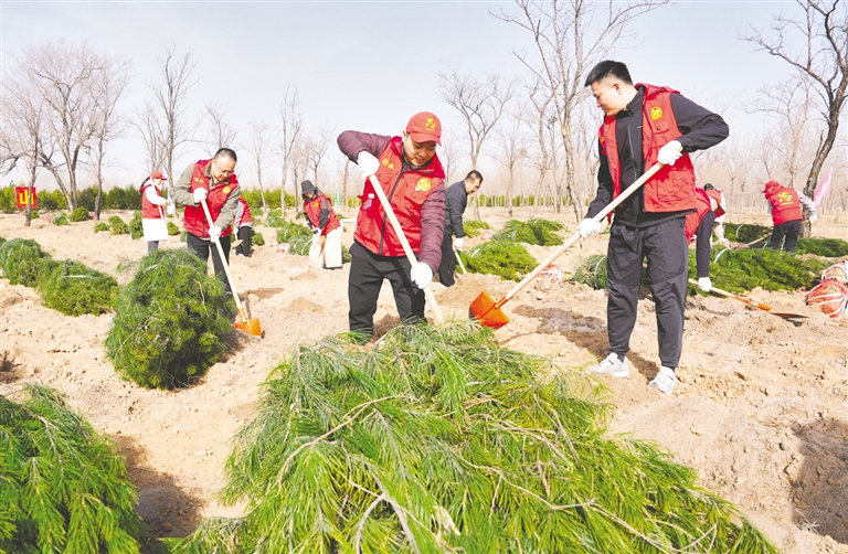 3月12日,志愿者在河北省石家庄市小壁林区植树。当日是植树节,各地开展植树活动,为春天增绿添彩。新华社发