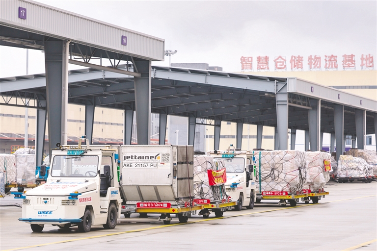 3月13日在杭州萧山国际机场货站拍摄的无人驾驶货物牵引车。当日,两辆无人驾驶货物牵引车在杭州萧山国际机场投入试运行。该型无人车基于通用自动驾驶技术打造,搭载了激光雷达、摄像头与定位系统,可做到厘米级精确定位,能够在机坪作业中实现多车协同、精准停靠装卸货、监测飞机位置自动停车避让等功能。 新华社记者 江汉 摄