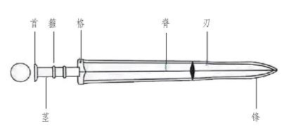 青铜剑主要由剑身和剑茎两部分组成。剑茎即剑的手柄,分为两层,内层较细,与剑身为一整体,内茎外再包一层茎。剑茎和剑身之间凸出来的护板叫做“格”,亦称护手。
