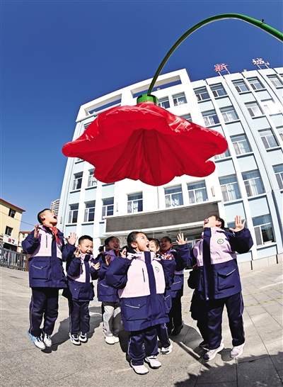 3月19日,学生们在红花下呐喊。为丰富学校课间活动,呼和浩特市光华小学开展了“总有一朵花为你绽放”减压特色活动,学生们在红花下呐喊,红花便会缓缓绽放,让学生们感受到花儿为自己盛开,以此增强他们的自信心。本报记者 孟和朝鲁 摄