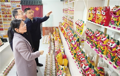 3月19日,人们在姜庄镇选购泥老虎产品。近年来,山东潍坊高密市发展泥老虎制作产业,形成以姜庄镇为中心的泥老虎制作特色产业乡村,每年可生产泥老虎40多万个,年产值突破千万元,助力乡村振兴。