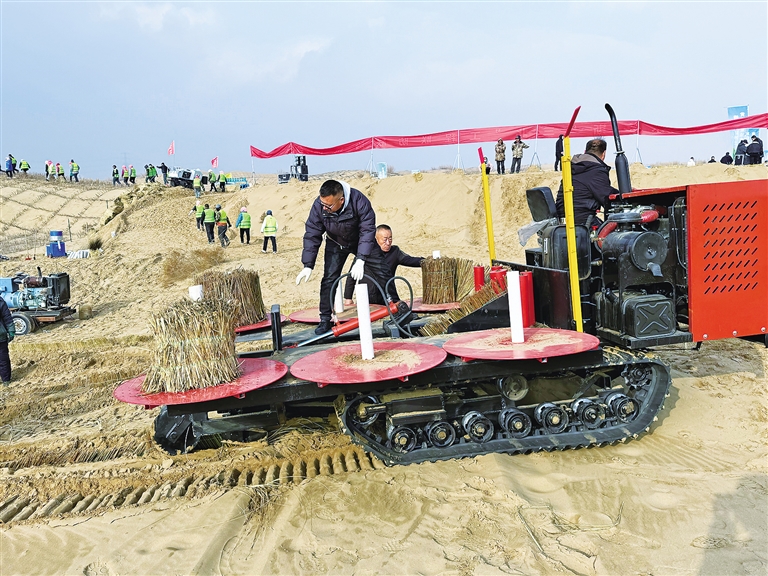 3月24日,在鄂托克旗乌大沙蒙宁联防联治项目区现场,一体化沙障铺设机正在有条不紊作业。今年,鄂尔多斯市重点生态建设项目机械化率达到75%,林草科技应用转化率达到60%。本报记者 毛锴彦 摄